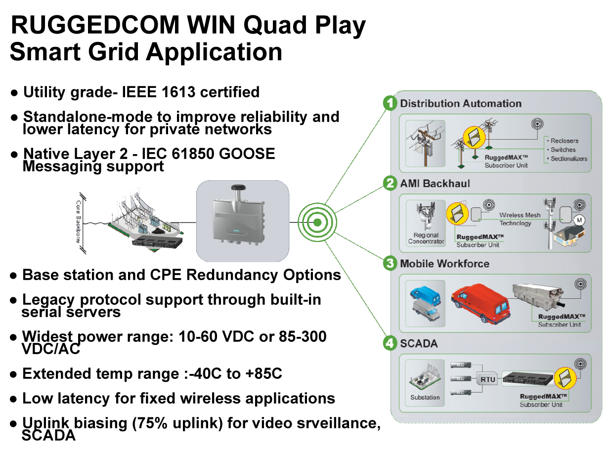 Siemens Ruggedcom Win Quad Play emerges as an all-encompassing solution poised at the forefront of advancing Smart Grid applications. With a comprehensive approach, this cutting-edge technology provides a complete suite of capabilities, seamlessly integrating and optimizing key components such as distribution automation, AMI (Advanced Metering Infrastructure) backhaul, mobile workforce communication, and SCADA (Supervisory Control and Data Acquisition) systems.